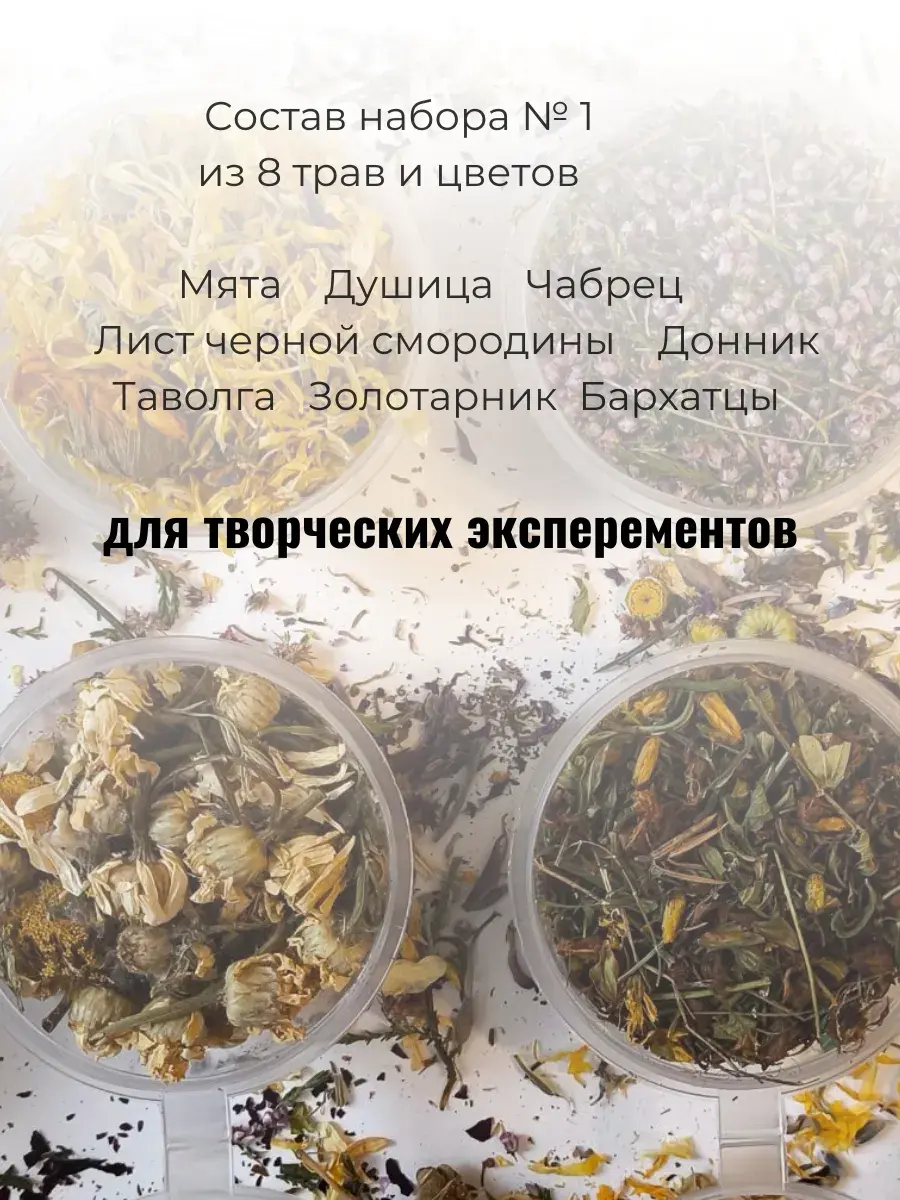 Состав набора трав и сухоцветов №1 Фея Леса: мята, душица, донник, чабрец, золотарник, таволга, бархатцы, лист черной смородины. 8 баночек по 50мл.