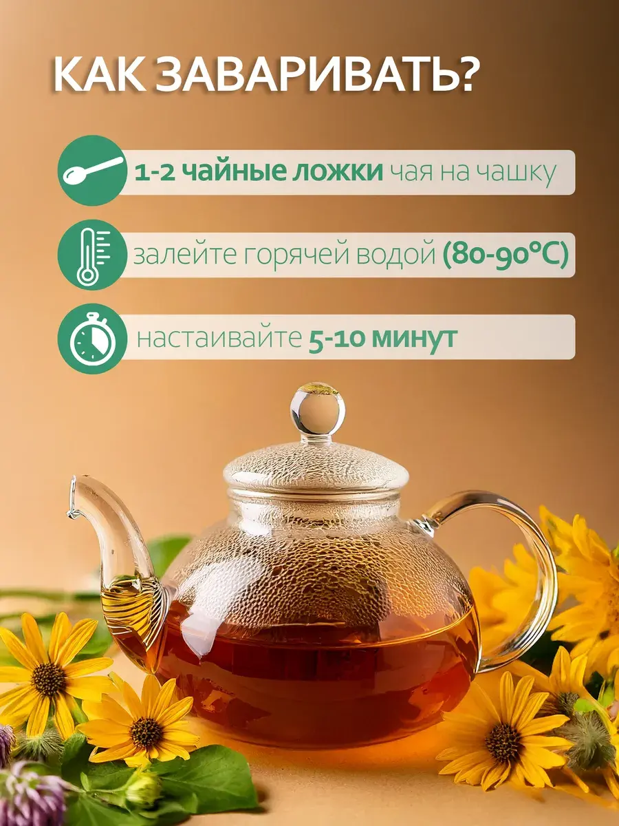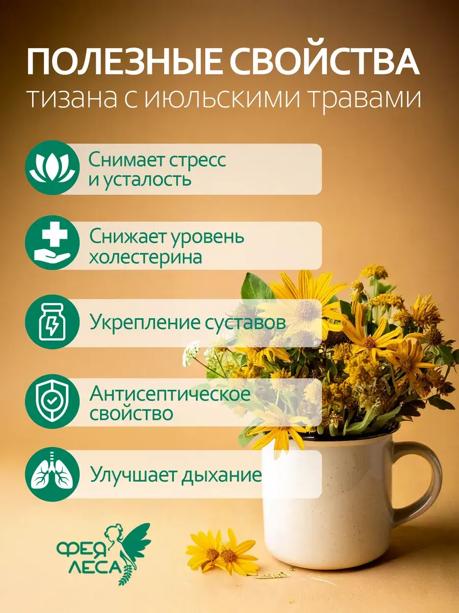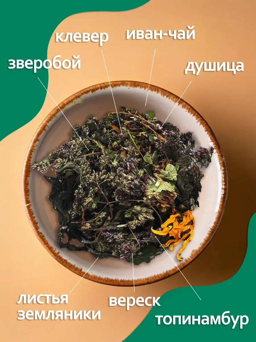 Полезные свойства этого уникального сбора трудно переоценить. Душица оказывает успокаивающее действие, снимает стресс и улучшает сон. Клевер укрепляет иммунитет и обладает антисептическими свойствами. Листья земляники богаты витаминами и минералами, которые поддерживают здоровье сердца и сосудов. Ферментированный лист топинамбура помогает нормализовать уровень сахара в крови и улучшить пищеварение. Вереск известен своими противовоспалительными свойствами и способностью ускорять регенерацию тканей. Зверобой улучшает настроение и борется с депрессией. Цветки иван-чая обладают общеукрепляющим действием и помогают организму бороться со свободными радикалами. Этот чай станет идеальным выбором как для повседневного употребления, так и в качестве ценного подарка близким людям.
