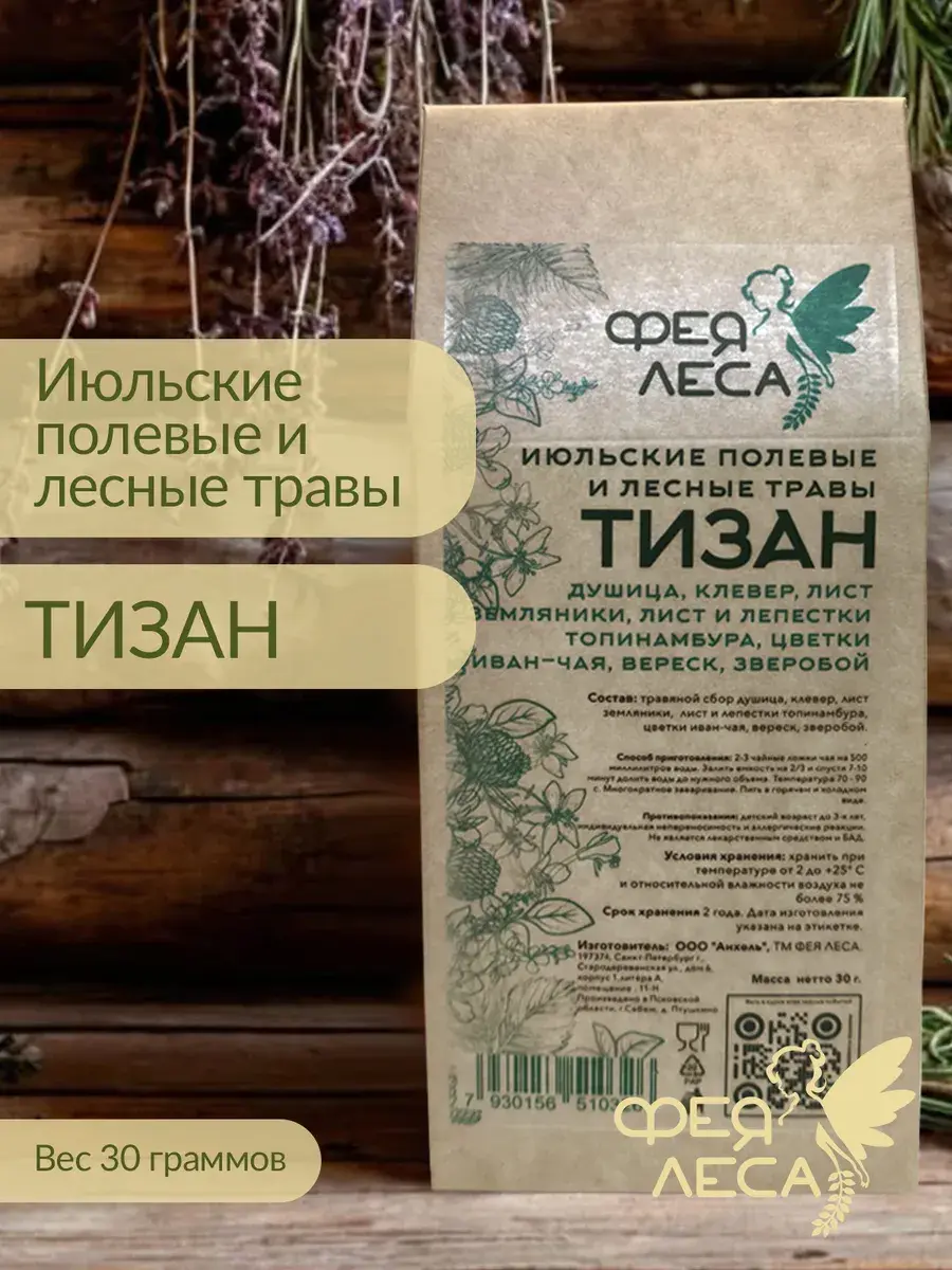 Тизан Июльские полевые и лесные травы заготовлены в ручную, цветочек к цветочку. Травы цельные, ароматные, в составе душица, клевер, лист земляники, ферментированные лист топинамбура с цветками и бутонами, вереск, зверобой,цветки иван-чая, вкус мягкий. польза трав.