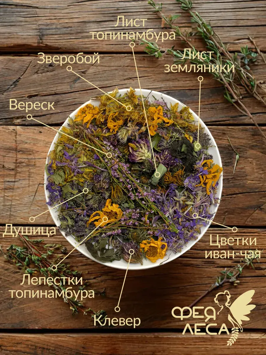 Полезные свойства этого уникального сбора трудно переоценить. Душица оказывает успокаивающее действие, снимает стресс и улучшает сон. Клевер укрепляет иммунитет и обладает антисептическими свойствами. Листья земляники богаты витаминами и минералами, которые поддерживают здоровье сердца и сосудов. Ферментированный лист топинамбура помогает нормализовать уровень сахара в крови и улучшить пищеварение. Вереск известен своими противовоспалительными свойствами и способностью ускорять регенерацию тканей. Зверобой улучшает настроение и борется с депрессией. Цветки иван-чая обладают общеукрепляющим действием и помогают организму бороться со свободными радикалами. Этот чай станет идеальным выбором как для повседневного употребления, так и в качестве ценного подарка близким людям.